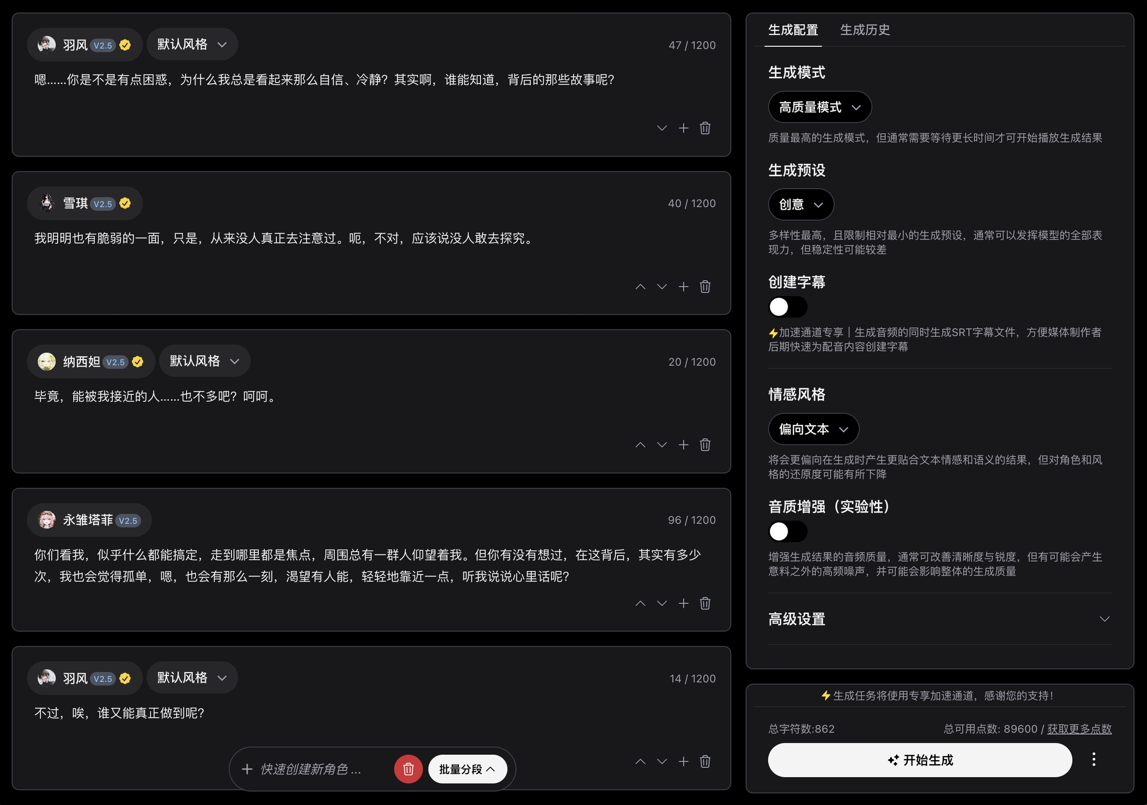 After you add or create some new characters, you can start using them to generate some speech! To perform Text-to-Speech (TTS), go to the Speech Synthesis page, add or edit some text freely, assign characters to them, and then click the Start Generation button in the Generation Configuration tab to complete it!