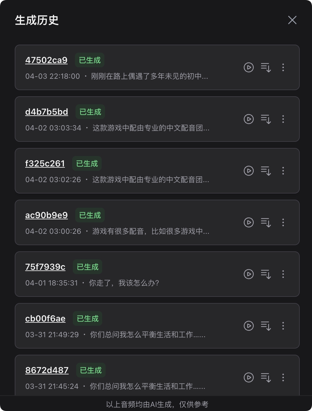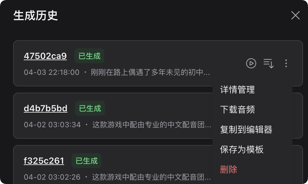 You can click to view details of each task in the list, play the final generation result of each task (if any), or quickly perform operations such as audio download, copy to editor, regenerate all content, delete task history, etc. in the dropdown menu of each task.