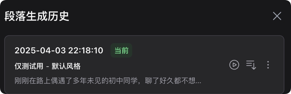 Now, individual paragraphs also have independently viewable generation history. Click the clock icon in the paragraph to open the popup, where you can compare different audio from each generation, get the best performance, or only adjust the content of individual paragraphs.