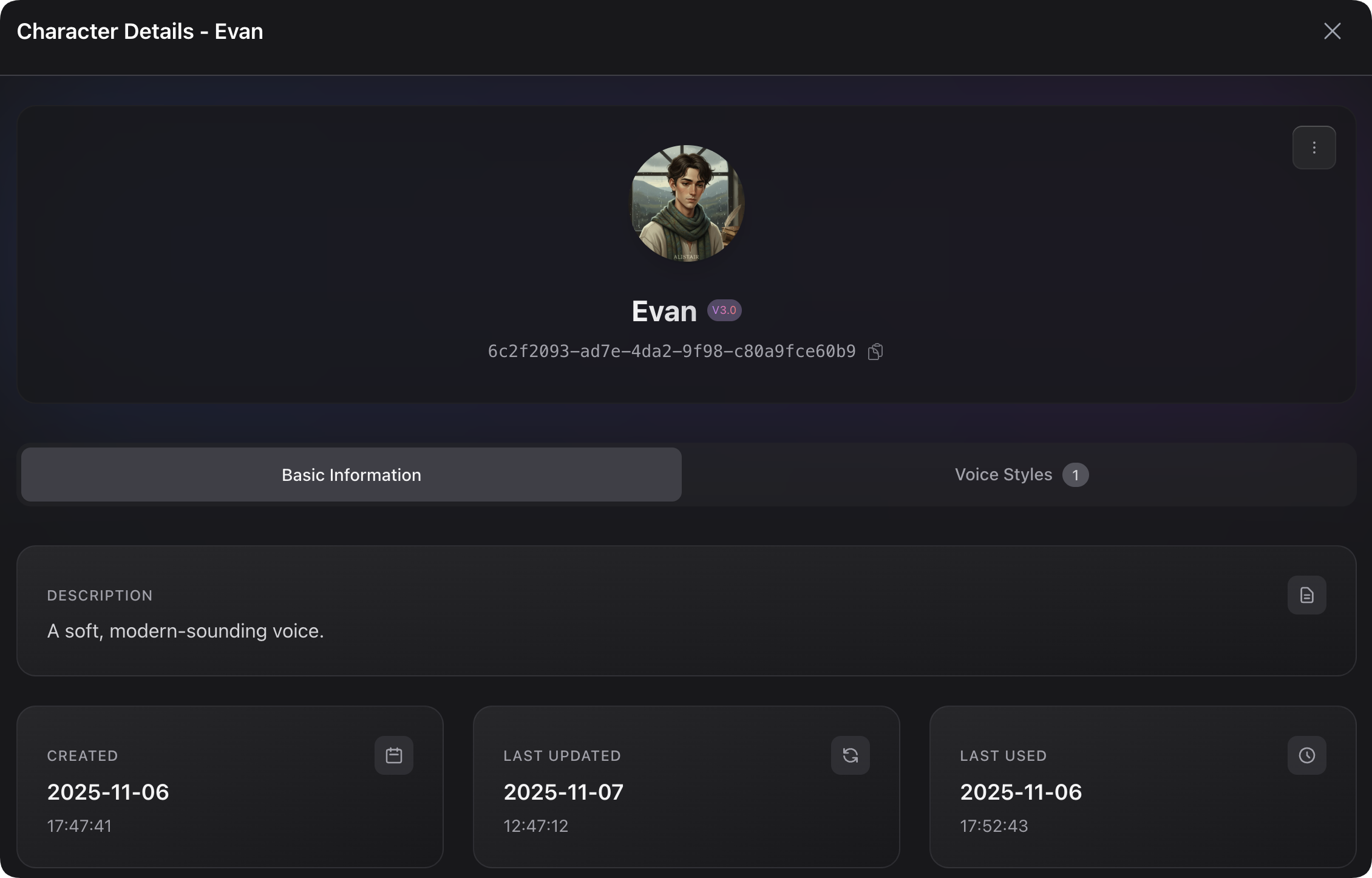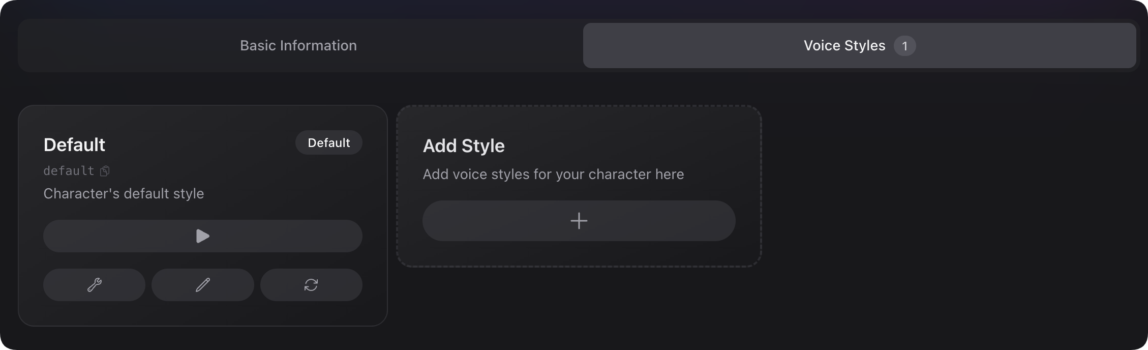 In the character details page, you will see a **"Voice Styles"** section. In it, you can add or delete various style guide samples for your character, and also preview each sample.