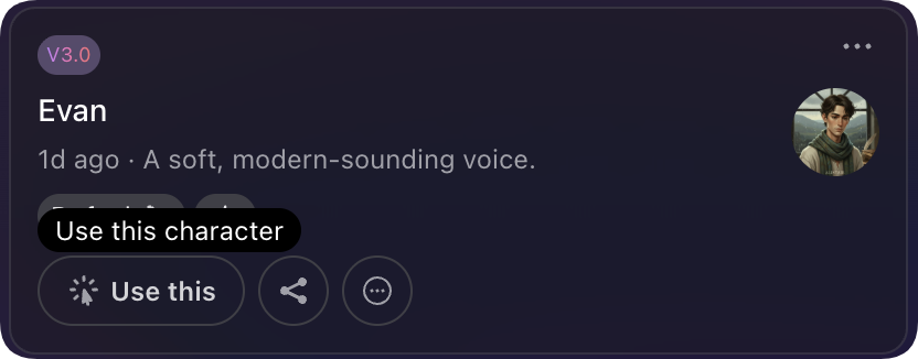 Character cards appearing in various locations all support one-click addition to the dubbing studio for generation. You can click the "**Use This Character**" button on the character card to add the character to the top blank paragraph of the dubbing text editor. For instructions on dubbing text editing, please refer to [Text Content Editing](https://docs.vocu.ai/generate/text-edit).