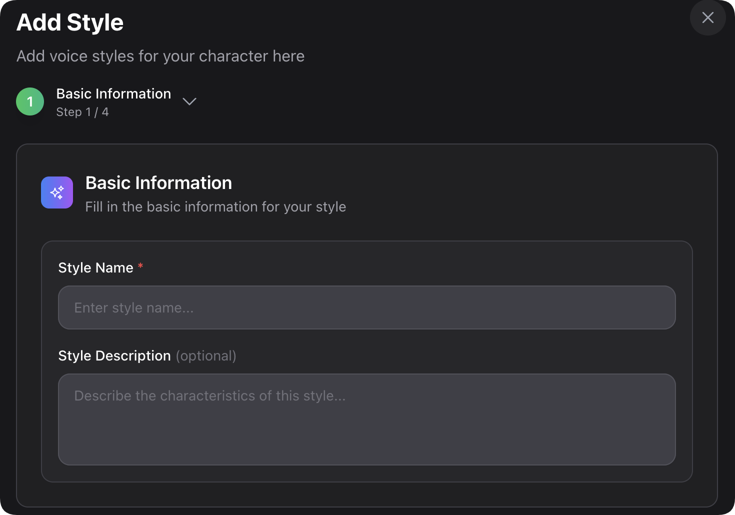 Similar to creating a character, you only need to click the **"+"** button in the upper right corner of the voice styles section to add voice styles for the character in the voice style creation panel that pops up.