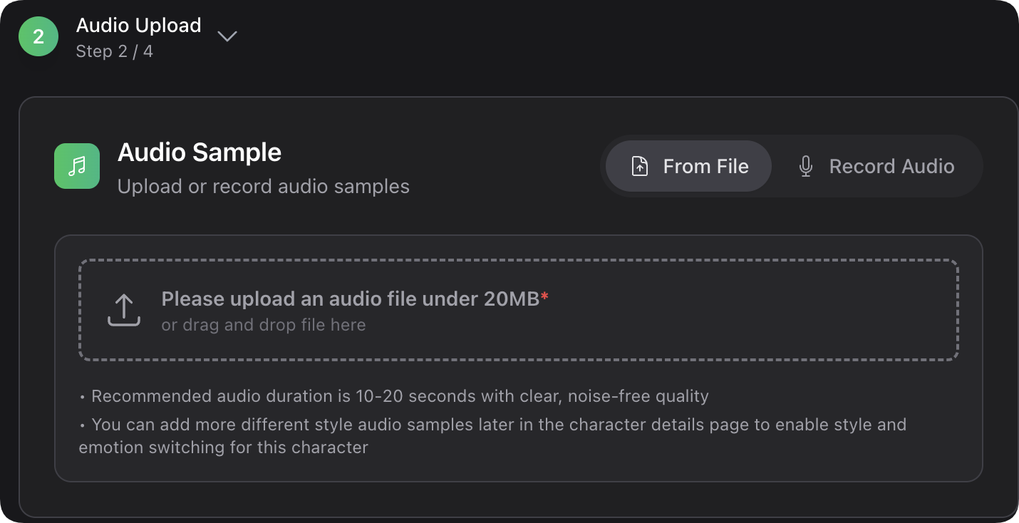 Then, you need to upload an audio file or record a piece of audio as the guide sample for this style. This sample **will be used to define the voice performance of this character style, including voice line, emotion, speed, tone, prosody, etc.**